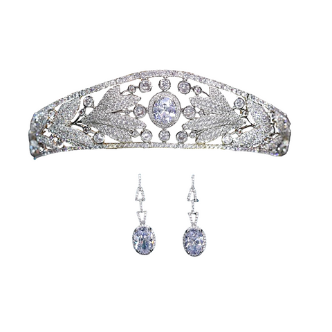 • This unique tiara replica and earring set is modelled after the Nassau Tiara, which was made for the Grand Duchess of Luxembourg, Princess Adelheid-Marie of Anhalt-Dessau. The original tiara, which was created during the 19th century, features motifs of leaves and berries, with a large main blue sapphire stone.
