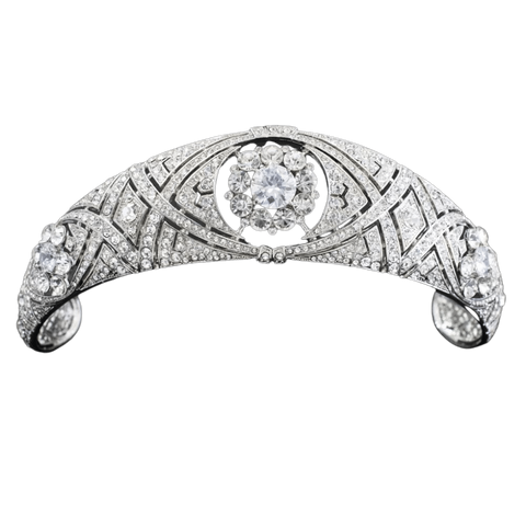 The tiara is “formed as a flexible band of eleven sections, pierced with interlaced ovals and pavé set with large and small brilliant diamonds.”