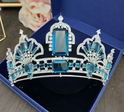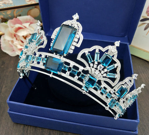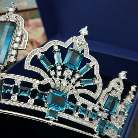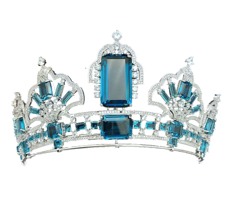 • One of the staff's favourites (have you seen the stones?), here we have the Brazilian Aquamarine Tiara replica that was given to the British Royal Family by, (you guessed it), the people of Brazil. What is interesting is the fact that the tiara was originally created from a necklace and earrings aquamarine and diamond set. Her Majesty had it created into a tiara that you see now. She last wore this stunning piece in public in Australia during the Commonwealth Heads of Government Meeting in October 2011.
